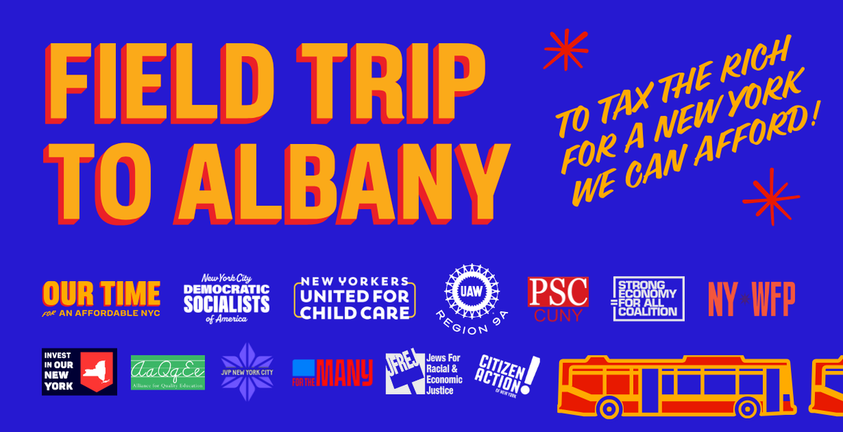 Thanks to our partners helping plan this day of action: NYC-DSA, UAW-9A, New Yorkers United for Child Care, PSC-CUNY, Alliance for Quality Education, Invest in Our New York, Strong Economy for All, Jewish Voice for Peace NYC, For the Many, JFREJ, NY Working Families Party, Citizen Action of NY.